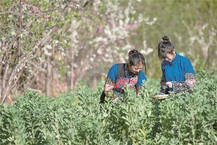 抬望眼,坡上繁花似錦,余暉里,若粉色華蓋覆于坡上,若云若霞。桃林置身峽谷之中,粉面朝天,明艷非凡,宛如閨秀;人家坐落山麓之上,披煙戴云,絕食煙火,疑為仙廬;山溪清卷碧波而去,棲云而眠,漱石而歌,響似佩環(huán)。橘色棧道蜿蜒而上,桃花林里若隱若現(xiàn)棧道間著漢服者,或留倩影,或嗅花香;拾級(jí)而上,又見(jiàn)客家姑娘,身著藍(lán)底配黑褂,綴以白色圖案,提籃摘豆,俯身拾花,別在耳鬢遠(yuǎn)望,若畫(huà)中紅印印在發(fā)間,身后白色梨花綠色葉。