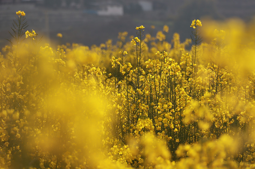 金黃的油菜花美美地填滿了整片田野,與藍天白云、村落人家相映成趣。順著田埂漫步花海,花香四溢,沁人心脾。微風吹來,一朵朵油菜花在風中搖曳,嬌嫩的花蕊隨風飄動,仿若身著金黃色輕紗的少女在翩翩起舞,靈動迷人。在花叢中飛舞的蜜蜂為花田增添了靈動和生氣,一掃冬日的沉悶,帶給人明快舒朗的好心情。成片盛開的油菜花與前來賞花的游人相映成趣,游人們拿出手機、相機,尋找最佳的角度,定格醉人美景,讓人忍不住贊嘆:好一番田園美景。