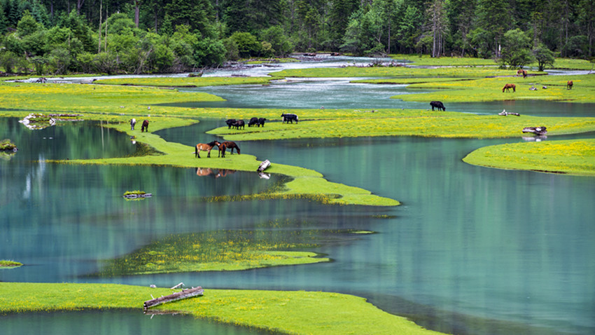 走進月亮湖,彎彎的湖水呈耀眼的寶綠色,湖邊是綠悠悠的草地,在這里扎營感覺就像是住進了綠野仙蹤的童話世界里。