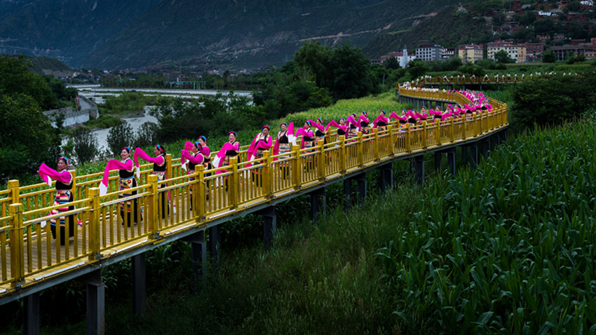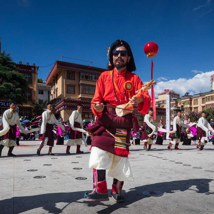 金弦子廣場,舞者們仿若守護(hù)者一般,圍著金黃色的弦子雕塑,或輕歌曼舞或昂揚(yáng)踏步,斑斕的畢旺、搖曳的流蘇和飄逸的紅袖與花共舞,與景相映,聲聲吟唱、步步踏尋,是追憶更是誓言。
