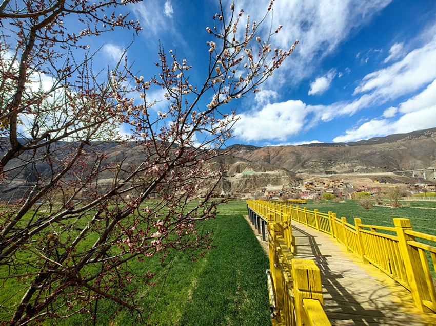 春意枝頭俏,桃花競(jìng)相開(kāi)。登高遠(yuǎn)望,巍峨青山綿延,山腳麥苗蕩漾,蒼茫山色間,一株株、一叢叢野生桃花星羅棋布點(diǎn)綴其間,加之一棟棟別致藏房掩映其中,春的美麗畫(huà)卷就此鋪展開(kāi)來(lái)。