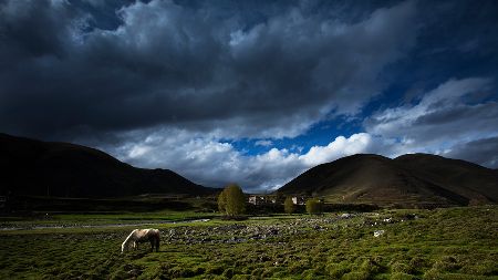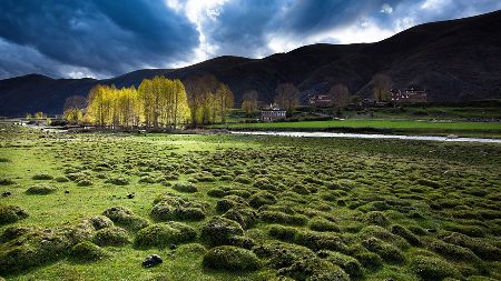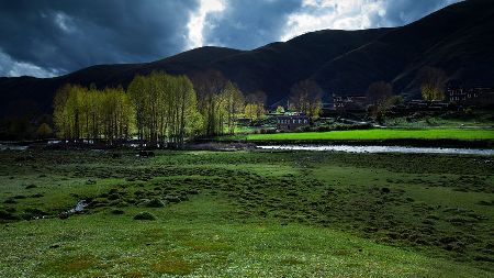 湛藍(lán)的天空下,雄鷹在盤旋,牛羊在安詳?shù)芈匠圆?,靜靜的小河在山邊蜿蜒流淌,充滿綠意的白楊樹在風(fēng)中搖曳,藏式民居不時(shí)升起縷縷炊煙,寂靜、空曠的原野深處偶爾會(huì)傳來(lái)幾聲狗叫高原的陽(yáng)光又賦予這幅風(fēng)景畫凝重的色彩這樣的畫面叫人心醉,讓人留戀忘返從折多山腳下至新都橋鎮(zhèn),再至塔公草原,處處都是入畫的美景,不愧稱為“攝影家的天堂”。