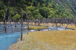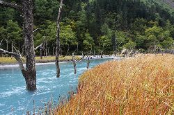 這里森林茂密,河流縱橫,生態(tài)原始,很多古樹浸泡在河水、沼澤之中,姿態(tài)怪異,神秘莫測,猶如置身侏羅紀(jì)時(shí)代。傳說這里是東巴神話《創(chuàng)世紀(jì)》的發(fā)祥地。