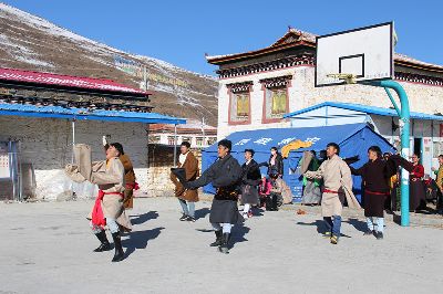 春節(jié)和藏歷新年期間,康定縣塔公鎮(zhèn)江巴村的寧?kù)o被孩子們的歌舞聲打破了,災(zāi)后的首個(gè)寒假,孩子們回到了父母身邊,一起跳起了歡快的鍋莊,表演豐富多彩的文藝節(jié)目。