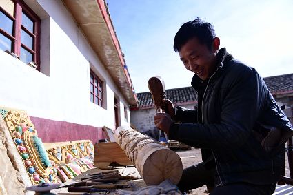 道孚民居的精華在其內(nèi)部,木材是其唯一的內(nèi)部裝飾材料,而裝飾,是一項繁瑣得曠日持久的藝術(shù)勞作,往往建房只需一兩個月,內(nèi)部裝飾則要幾年甚至幾十年。民間建筑藝術(shù)家們沉醉在細致入微的勞作里,讓每一個圖案都盈溢一份心底的吉祥,讓每一筆描摹都傳遞一份動人的傳說。房間四壁、房門和梁柱上一般都繪滿了精致典型的藏式壁畫,窗上分別雕刻著龍、鳳、仙鶴、麒麟等吉祥圖案。每間屋的大門上都鑲嵌醒目的兩個獅頭大銅環(huán),凸顯了與之相融的漢文化的特點。置身其間,色彩斑斕中,身邊盡是龍飛鳳舞,鶴翔麟躍。繽紛中細端詳,真是藏民族藝術(shù)的天堂!