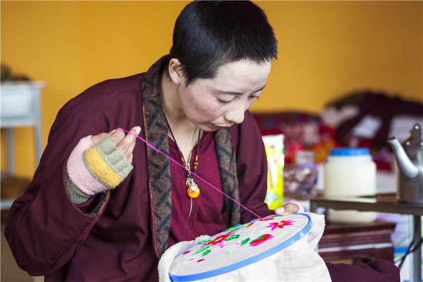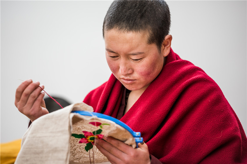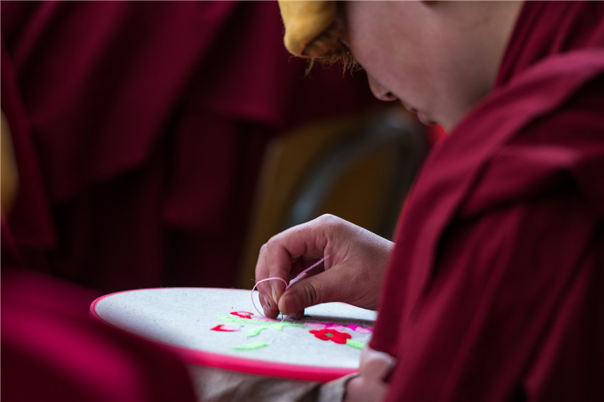 行攝途中經(jīng)過塔公鎮(zhèn)扎西寺,遇見康定市婦聯(lián)邀請到的中國國家級非物質(zhì)文化遺產(chǎn)藏羌織繡傳承人,正在為自愿報名的數(shù)十名覺姆傳授藏繡圖案基礎知識、藏繡圖案的常見表現(xiàn)形態(tài)、挑繡、納花繡、鏈子扣、扎花、提花、拼花、勾花和手繡等各種繡法技能。佛教的學習本是無止境的,我被這安靜、專注的場景深深感染,按下相機快門的一瞬就記錄了朵朵盛開在指尖的蓮花。
