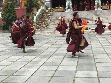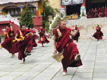 跳神儀式開始,南無寺內(nèi)鼓號齊鳴,喇嘛身著顯耀盛裝,點燃新綠松枝,幾縷藍色煙紋升起。一支由法鼓、鈸、海螺、法號等組成的寺廟樂隊自大殿而出,順時針繞場一周落座場邊,群神出場繞圈而舞,以示凈化場地,祈請諸神入位。接著,象征護法神舞、骷髏舞、鹿神舞、黑帽咒師舞和金剛力士舞的演員手持各類法器挨個入場手舞足蹈。舞蹈的起落根 據(jù)場邊奏響的器樂節(jié)奏進行。最后由眾神驅(qū)鬼逐邪,押送“朵馬”(由糌粑捏成用以供神施鬼的食品)至寺外拋丟焚燒,以示驅(qū)逐一年的邪魔,祈禱來年安樂。