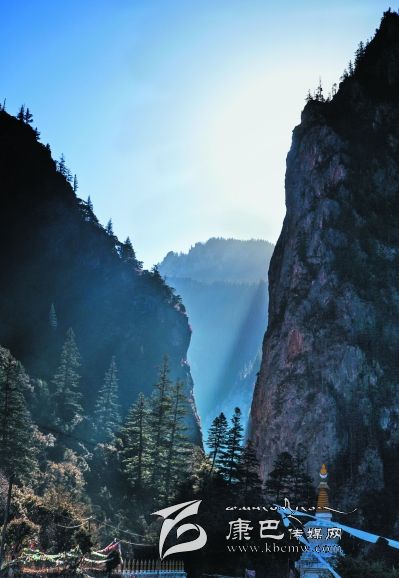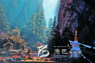 進(jìn)得溝來,卻又是另一番景致。溪水在窄細(xì)的深谷中忽隱忽現(xiàn),水聲叮咚,時而從碎石卵灘下潛淌,時而冒出雪花樣的身影,不張揚(yáng),含靦腆,與兩邊千仞峭崖的兇猛樣恰成強(qiáng)烈對比。此時容不得你不抬頭望山,望天了。極盡險峻的峭壁奇峰,危巖巨石,陰面如潑了墨暈,陽面露了慘白,硬硬地把個溝谷擠成了“一線天”,駭?shù)谜锪锏奶焐弦粌蓤F(tuán)亂云也不敢停歇片刻,欲飄走,卻又被錯落參差的山峰撕得七零八落。更有那墨黑如黛的松柏齊齊地排隊(duì)豎立在危崖峭壁間,或一兩階,或三四階,如挎刀武士護(hù)著峭崖,又如黑大漢長的亂糟糟的絡(luò)腮胡,徒增添了猙獰之貌。傳說皮察溝內(nèi)有座黑教的神山——呷拉神山,每到“朝山會”,農(nóng)牧民前去神山朝拜。然而,呷拉山頂不知何時棲居了一只碩大的“夏甲曲絨”(意為一種兇惡的鳥),不時將村里百姓的牛、羊叼到山頂吞食。藏王格薩爾得知此事,決心要除掉“夏甲曲絨”。 “夏甲曲絨”得知格薩爾王大軍前來征服它,十分懼怕,數(shù)日藏于洞中不敢出來。格薩爾王隱身于巖石背后,讓王妃珠牡設(shè)法引“夏甲曲絨”出洞。“夏甲曲絨”形體碩大,棲息的洞無法掩其全身,頭部露在外面,時時觀察動靜。珠牡到接近洞口的地方,滔滔不絕地贊譽(yù)“夏甲曲絨”長得美麗,它禁不住贊美,漸漸地伸長頭頸,最后驕傲地露出潔白的全身,并高昂著頭。格薩爾王趁機(jī)迅速張弓搭箭,一箭射中“夏甲曲絨”的頸部,血流滿山,以后這座山便變成了紅山。當(dāng)“夏甲曲絨”負(fù)痛逃至皮察溝“一線天”時已精疲力竭,便停留在山崖中。格薩爾王隨即趕到,藏于灌叢,背靠巨石用腳一蹬(至今天一巨石呈凹形,似有人蹬過),再次射中“夏甲曲絨”。“夏甲曲絨”負(fù)痛逃去,停在覺然村一巨石上做垂死掙扎時,它的爪爪在巨石一抓了無數(shù)道溝痕,后人把這個巨大石稱為“鬼抓石”……我無意去尋找“紅山”、“腳蹬石”、“鬼爪石”等,也沒想深究格薩爾除妖是否用過“美人誘惑計(jì)”,但卻在溝谷里發(fā)現(xiàn)一個與眾不同的現(xiàn)象:在一處窄小的谷地路傍,長滿了雜枝黑蔓的灌叢,灌叢上彩幡密布,鉆進(jìn)灌叢,里邊竟然塑了一尊格薩爾王的神象,神象不高大,卻威儀,的確像是藏在崖壁下灌叢中……很容易讓人想到故事中的情節(jié)。