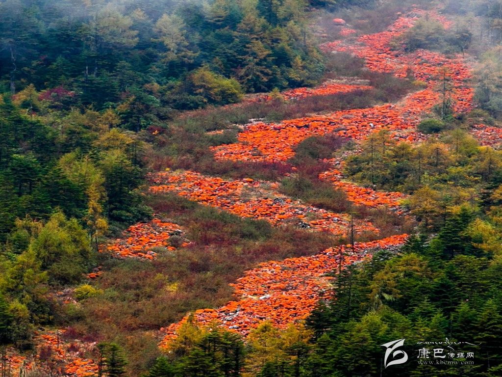 路段兩邊就是貢嘎雪峰所在的大雪山,貢嘎雪峰是整個橫斷山區(qū),也是青藏高原東部最高的山峰,海拔高達(dá)7556米。圍繞著貢嘎雪峰有許多海拔五六千米的雪峰,這條路就要從這些雪峰中的一處低矮處通過。我看到一條條冰川從雪峰下流淌下來,冰川流動的速度太快,還來不及融化,就沖進(jìn)了郁郁蔥蔥的森林,冰川末端融水形成的河流蜿蜒地流淌在針葉林中。河谷很寬闊,這是洪水和泥石流暴發(fā)時沖出來的。然而奇怪的是本來應(yīng)該是灰白色的卵石鋪就的河谷,現(xiàn)在卻是鮮紅的顏色。紅色的河谷從雪山一直鋪陳下來,好像是一個油漆匠把他的油漆桶弄翻了,紅色的油漆流淌出來,又好像行為藝術(shù)家的大制作。