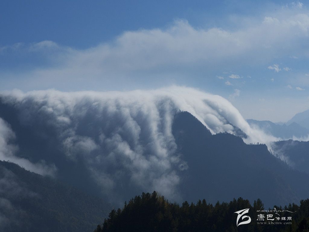 牛背山最為變幻無窮的,當(dāng)屬云海。從山頂向下望去,四周云海茫茫,時(shí)而舒緩,時(shí)而洶涌,潮起潮落。當(dāng)云海移至深谷處,會(huì)因?yàn)榫薮蟮穆洳疃纬善俨荚疲骑w瀑從天而降,氣勢(shì)磅礴,蔚為壯觀。“寵辱不驚,閑看庭前花開花落;去留無意,漫隨天外云卷云舒”。云卷云舒的景象,大概只有在牛背山才能被演繹得如此淋漓盡致吧。難怪有人這樣描述牛背山:“泥巴山、瓦屋山、峨眉山、夾金山、四姑娘山和二郎山在前, 貢嘎雪山在側(cè), 大渡河大峽谷在后, 幾乎天府之國的所有名山峻嶺在此時(shí)都變成了玲瓏盆景。而翻滾的云霧之下, 群山丘陵逐級(jí)降低, 緩緩融入稻浪翻滾的天府平原。”