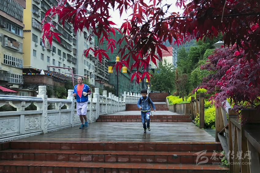 圖為晨練的市民和上學(xué)的小朋友愉快地通過阿里布果步游道。(馮光福 攝影報(bào)道)