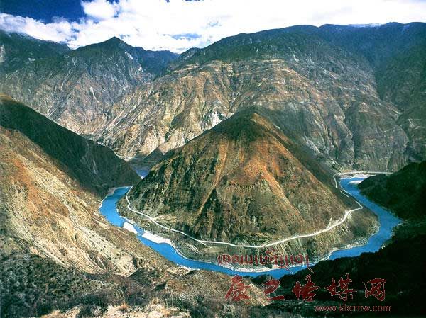 金沙江第一彎以“雄、奇、險、峻著稱,位于距得榮縣城60公里處的甲學(xué)村和木擁村之間。由北向南縱貫全境的定曲河,在先后接納瑪伊河和碩曲河后,攜三河之水投入金沙江懷抱。匯水處形成了“三壁夾兩江”的奇景。穿越峽谷而來的金沙江由此水勢更加浩蕩,峽谷逐漸開闊,在即將沖出川、滇要塞時,由于高山的阻擋,拐了一個馬蹄形的大彎,流成了天下奇觀——中國四十大景觀之一的“金沙江第一彎”。從云南境內(nèi)的奔子欄,可以更完整地欣賞“金沙江第一彎”。
