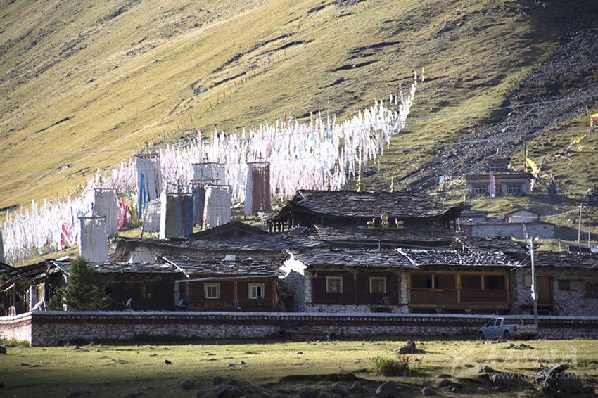 當太陽落進金龍雪山的懷抱,最后一抹余暉斜照在靜靜的莫斯卡村莊上。東邊的小河在斜陽里歡快的流過村莊,莫斯卡的女人在夕陽里,正領(lǐng)著孩子回家。西邊牧歸的男人悠閑的向山下趕著牦牛。村莊背后漫山的經(jīng)幡,在晚風里誦經(jīng)祈福……格薩爾王的傳說就在這樣的時光里,雕琢成了漫山的石刻,在經(jīng)年的歲月里傳頌。