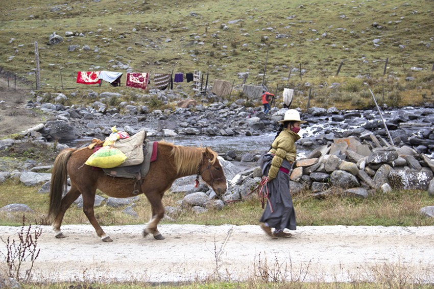 莫斯卡的女人或在寺廟點酥油燈,或帶孩子,或牽馬牧草,或在溪邊淘衣,或出門打水……她們的勤勞和樸實滋養(yǎng)著莫斯卡,滋養(yǎng)著莫斯卡的生命。她們用黑、紅、綠那樣跳躍的顏色搭配出獨具風格的服飾,背著你遠去,又迎著你走來,她們美麗的背影裝扮了寂靜的莫斯卡小巷。