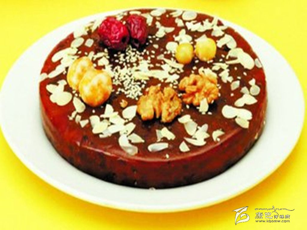 八寶年糕 原料 糯米1000克,白糖、麻仁青梅、葡萄干、瓜條、白蓮、桃脯、豬油各20克。 做法 先將糯米淘洗干凈,水浸24小時后上蒸籠蒸爛,取出用木棒搗爛攤涼,把白糖等搓勻成餡,在方盤內(nèi)刷豬油,鋪上搗爛的1厘米厚的糯米飯,每鋪一層放入適量的餡,共鋪3層,蒸熟后用刀切為小塊即成。 夾心年糕 原料 糯米1000克,青紅絲、小豆、白糖各50克。 做法 將糯米洗凈浸泡24小時后上蒸籠蒸爛,取出用木棒搗爛后展切成2塊,把小豆煮爛加糖再加青紅絲做成餡撒于其中一塊上,再將另一塊放在餡上壓實(shí)壓緊,用刀切成塊即可。