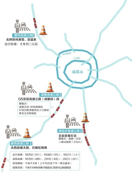 回成都如遇擁堵,交警建議,從瀘州、自貢出發(fā)回成都的車輛,可在成自瀘高速寶飛或仁壽站下高速,經(jīng)老成仁路返回成都;自貢、內江的車輛不一定非要來擠成自瀘,可選擇樂自、宜瀘、樂宜高速返回成都。如果成都站出站車流量大,可選擇大林站、興隆站,從老成仁路、雙流錦繡東山快速通道到成都。