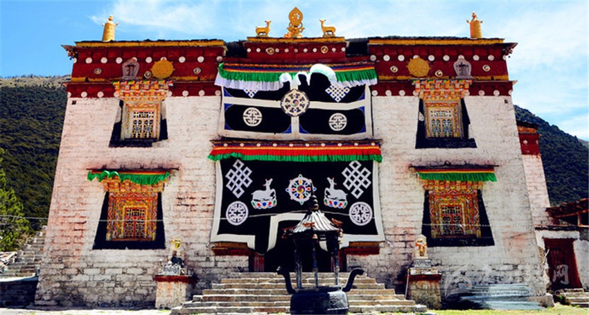 沖古寺既是觀賞三座神山的必經(jīng)之地,也是當?shù)夭刈迦罕娹D山儀式的出發(fā)地。沖古寺前的沖古草坪風景一流,并且在此可以以很好的角度觀賞到仙乃日和夏諾多吉。