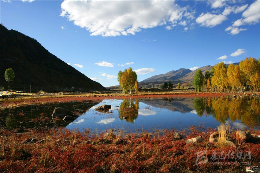 當短暫的夏天過去之后,亞丁迎來了它最令人心醉和神秘的秋天,“秋葉與雪峰相擁,碧水共長天一色”。一夜的秋風吹過,山體和大地都改變了模樣,整個亞丁變得厚重而深沉。雪山之下的森林由單一的綠色變成深綠與金黃相間。深綠的是不落葉的云杉和冷杉,金黃色的是四川紅杉的松針,山楊也是金黃色,但這種金黃是一種透明的金黃。各種鐵樺槭的顏色是艷麗的紅色,像火一樣。草地上的綠草也不再是綠草,而成了衰草,但這些枯草并不凄涼和蕭瑟,而是在風中搖曳著最后的顏色,從容地接受冰雪的到來,從容地等待著來年的再次勃發(fā)。