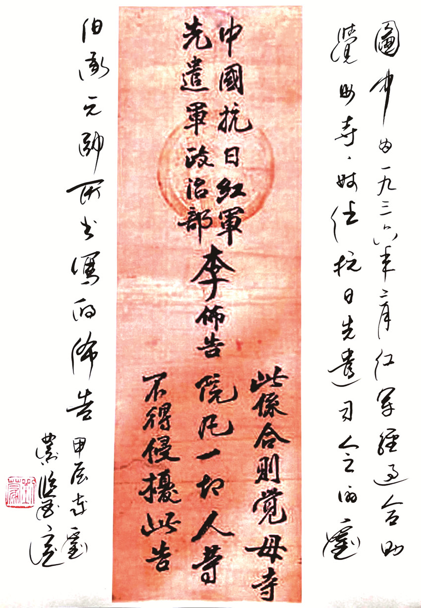紅軍在合則覺母寺的布告,從1936年3月我父親任中國(guó)工農(nóng)紅軍抗日先遣軍司令、布告的書法與此后的書法絕然相似,結(jié)合紅軍和平進(jìn)駐甘孜的史實(shí)等因素,進(jìn)行綜合分析,我認(rèn)為此布告為我父親劉伯承所寫。