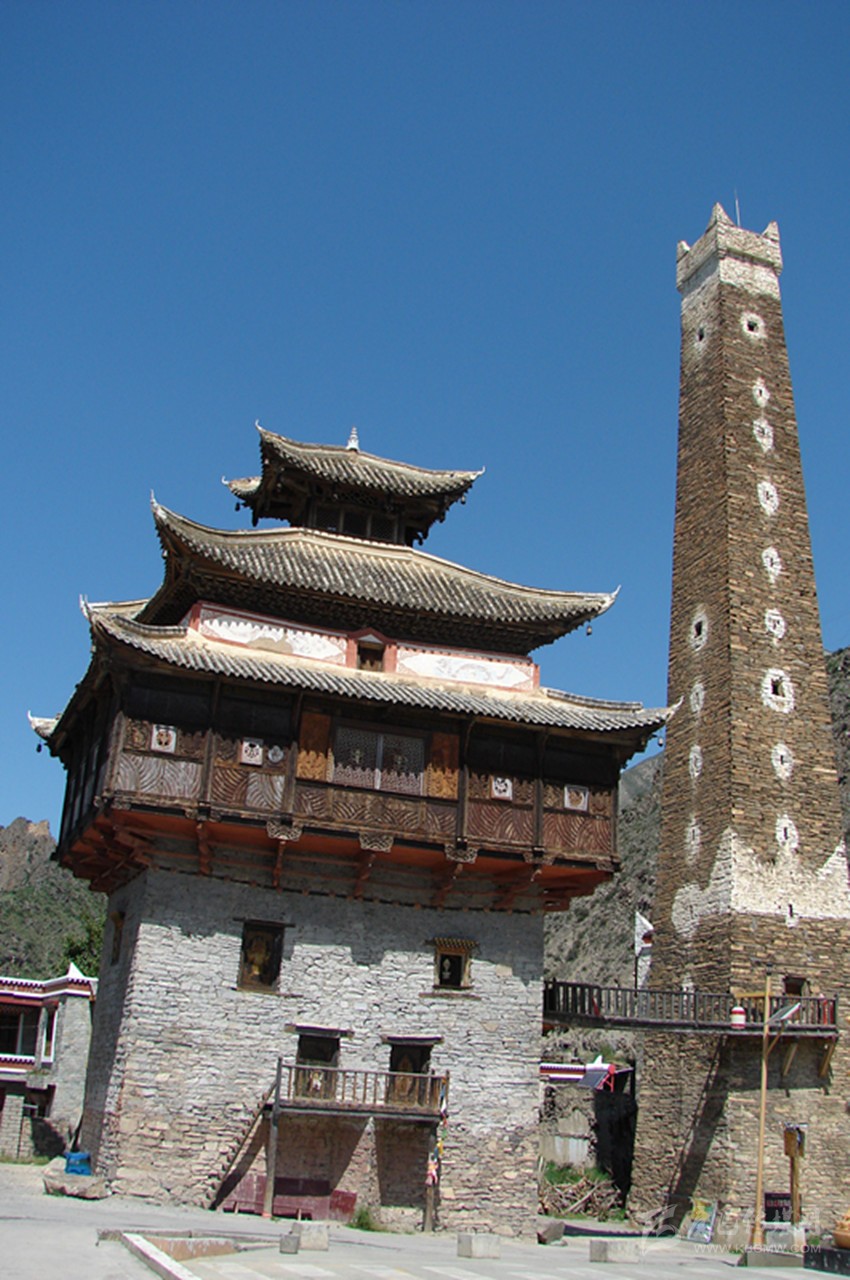 站在廣場中央仰望,碉樓有十五層高,約有二十余米,其外墻為片石壘砌,并附建有經(jīng)堂碉及過街樓,防御性極強(qiáng)。整座碉樓在修建中,層層收分,從墻面往上看,傾斜面在八十度左右。到達(dá)碉樓頂,面積只有四平米左右,在每一層樓里,都有外窄內(nèi)寬的窗戶,是典型的堡壘式射擊孔。在通往碉樓頂?shù)拿恳粚臃块g內(nèi),都有一根獨(dú)木梯連接著。第一層為石材壘筑的實(shí)心體,這種建筑方式為碉樓下大上小、重心向內(nèi)、穩(wěn)定性強(qiáng)的特點(diǎn)奠定了牢固的基礎(chǔ)。碉樓內(nèi),水源路網(wǎng)環(huán)環(huán)相通,倉儲(chǔ)空間很大。第二層為放置日常用品的地方,房門開在第三層,連接地面的依然是一根獨(dú)木梯,若遇敵人來犯時(shí),人們便從獨(dú)木梯上攀援而上,再將獨(dú)木梯抽取。這樣,一座碉樓就固若金湯,只需從射擊孔中射出箭,或者從碉樓頂?shù)乃慕侨酉乱粔K塊巨石,不管敵人是如何的孔武有力,還是擁有如何的謀略,在碉樓面前都會(huì)束手無策,最后只能選取最原始的進(jìn)攻方法——圍而不攻。坐待碉樓里的人彈盡糧絕之日,不過,人們在修建碉樓時(shí),已充分的考慮了這些因素,在每一層樓里都儲(chǔ)備了足夠幾年之需的食物和水,這樣,往往是圍攻的人耐不住性子,最后只好悻悻然退卻。