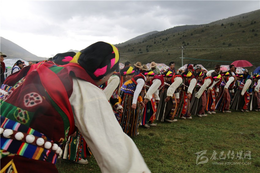 10月2日,在木雅鍋莊悠揚(yáng)的旋律和輕盈的舞步中,歷時(shí)兩天的“2017康定情歌國際音樂節(jié)”盛大開幕,作為“五大民俗展演”中的特色民俗歌舞表演部分,木雅鍋莊吸引了眾多游客的關(guān)注。木雅鍋莊來源于木雅人的日常生產(chǎn)和生活,是當(dāng)?shù)剞r(nóng)耕文化習(xí)俗的重要表現(xiàn),表演服飾多以棕紅色外套,紅、白色襯衫為主,表演者多佩戴紅頭繩、珊瑚、金銀等裝飾物。舞蹈分男女兩組,列隊(duì)圍桌成圓形,皆彎腰垂首隨領(lǐng)唱歌聲而舞。男組舞姿氣勢(shì)豪放,女組舞姿委婉優(yōu)雅。唱腔宛轉(zhuǎn)悠揚(yáng),吸引了在場(chǎng)觀眾冒雨駐足觀看,有的甚至情不自禁隨著舞群踏起了舞步,融入到康巴文化的神秘魅力當(dāng)中。