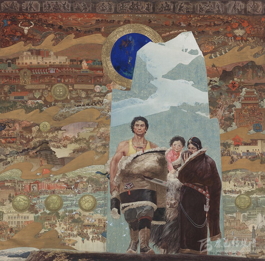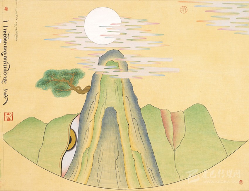 15世紀以來,唐卡發(fā)展所恒定的兩個元素:一是平面構圖的神佛之境,另一則是吸收大青綠山水精髓。正如DNA鏈的雙螺旋結構一般,使唐卡繪畫在歷史時空中穿插縈繞,在雪域各地生根開花。到了公元20世紀初,照片的高度寫實促使藏地畫家邁出了革新步伐,使得唐卡繪畫逐漸擺脫傳統(tǒng)束縛,開啟了“人”的覺醒。衛(wèi)藏地區(qū)出現(xiàn)了“根敦群培、安多強巴”引入寫實主義的嘗試,成為當今西藏“布面重彩”的先驅(qū)。新中國成立后,內(nèi)地的美術創(chuàng)作積極影響了三大藏區(qū)的繪畫發(fā)展,上世紀80年代,四川康區(qū)“甘孜藏畫”肇起,在《嶺·格薩爾王》人文主義的召喚下,《雪山兒女》《唐東杰布》《新概念唐卡》正從歷史深處一路走來。而近年來,安多藏區(qū)則創(chuàng)新出了“藏族祥巴版畫”,祥巴版畫不僅是從材料技法上對西藏繪畫的豐富,更是藏地畫家們在自覺不自覺的求新、求變;甚至在傳統(tǒng)唐卡領域,民間畫師也都在紛紛嘗試將傳統(tǒng)唐卡和現(xiàn)代審美相結合。這一切,正是唐卡繪畫從傳統(tǒng)走向現(xiàn)代、由宗教博衍至生活的演變過程,在這個過程里,藏地畫家不僅在畫面的形式和語言上完成了傳統(tǒng)與當代的統(tǒng)一,還將西藏的審美特質(zhì)虹化為作品的精神內(nèi)核。這也是唐卡藝術第二次“從香巴拉到人間”的過程,成為民族文化發(fā)展的新坐標。