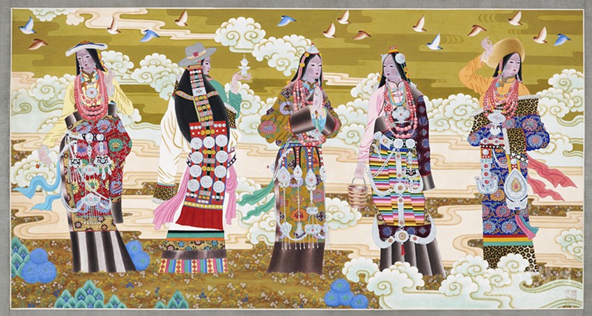 青藏高原有著曠遠弘大的人文地理,有著神秘久遠的宗教文化傳承,正是這蒼茫大地孕育了藏族人;正是這片極度追求審美體驗并把生活高度藝術化的疆域,滋養(yǎng)了西藏藝術。從早期的巖畫、旗幡畫、唐卡、壁畫,再到當代的丹青重彩,無不生發(fā)于這片神奇高原,皆是中華民族文化寶庫中燦爛的牟尼寶珠。唐卡繪畫肇啟于松贊干布隆興之時,向南學習印度、尼泊爾布畫,往西受到犍陀羅藝術浸潤,向東融合唐、宋、明、清之審美,再集藏地宗教文化、民族審美熔為一爐,鑄就一千三百年唐卡繪畫之法脈。它不僅是獨具魅力的藏文化之血脈源流,更是各民族文化交融、和諧互生的典范,對世界藝術有著深遠的影響。