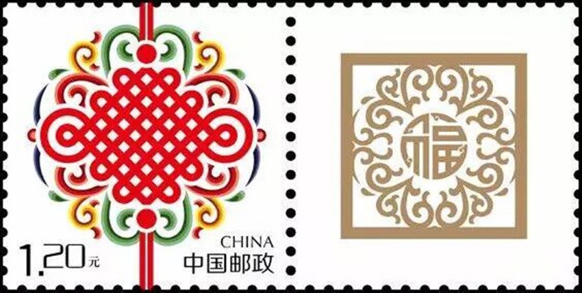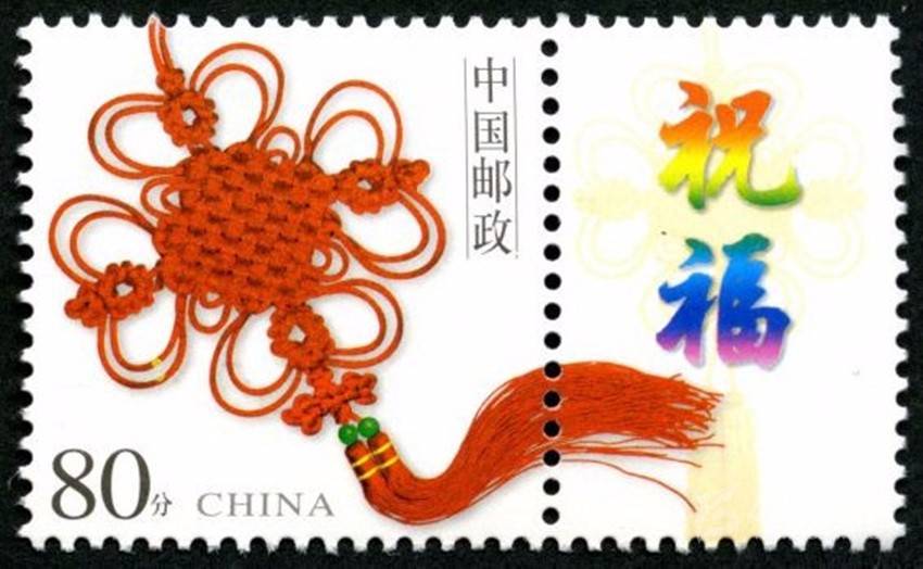 2002年5月10日,中國(guó)郵政發(fā)行《如意》個(gè)性化服務(wù)專用郵票一枚。主票圖案為如意柄端系著一個(gè)紅色“中國(guó)結(jié)”,附票有“祝?!倍?; 2003年3月3日,中國(guó)郵政發(fā)行《同心結(jié)》個(gè)性化服務(wù)專用郵票一枚。主票圖案為盤長(zhǎng)結(jié)4邊編織有心型繩結(jié)的同心結(jié),附票為“祝?!倍?;2006年9月25日,中國(guó)郵政發(fā)行《中華全國(guó)歸國(guó)華僑聯(lián)合會(huì)成立五十周年》紀(jì)念郵票一枚。圖案為阿拉伯?dāng)?shù)字“5”與中華全國(guó)歸國(guó)華僑聯(lián)合會(huì)圓形會(huì)徽組成數(shù)字“50”,象征全國(guó)僑聯(lián)五十周年,背景畫面為淡淡的粉紅色“中國(guó)結(jié)”。寓意歸國(guó)華僑與全國(guó)人民血肉相連,同心同德共同建設(shè)美好家園;2013年8月8日,中國(guó)郵政發(fā)行一枚《美好祝?!焚R卡專用郵票,圖案為象征喜慶的紅色“中國(guó)結(jié)”;2014年9月20日,中國(guó)郵政發(fā)行《中國(guó)夢(mèng)(二)——民族振興》特種郵票,其中第四枚“民族團(tuán)結(jié)”,圖案中載歌載舞的各民族群眾上方有一個(gè)大紅的“中國(guó)結(jié)”,象征著各民族大團(tuán)結(jié)。