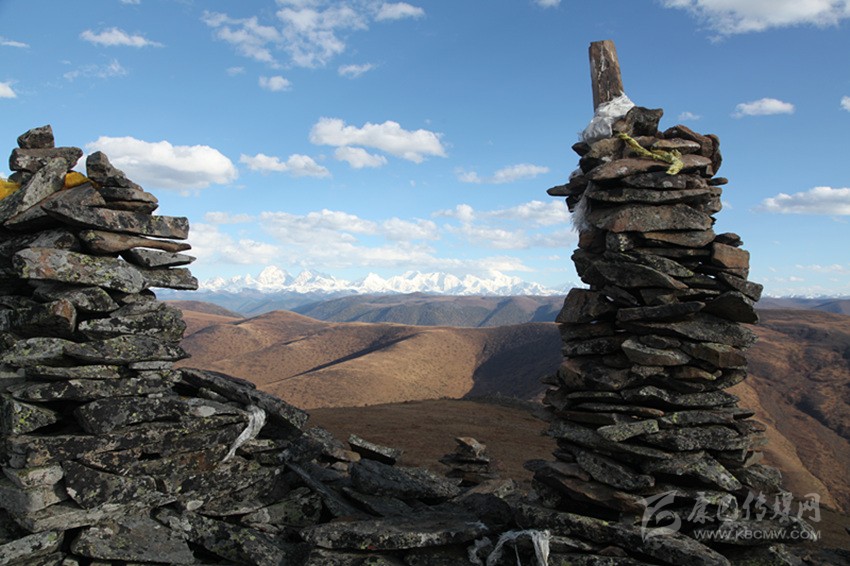 在高爾寺山頂,一個(gè)標(biāo)注有海拔4412米的藍(lán)底標(biāo)志牌顯得有些孤單,與之相伴的,除了呼嘯的大風(fēng)外,還有隨風(fēng)飄動(dòng)的嘛呢旗。頭頂?shù)乃{(lán)天沒(méi)有一朵云彩,遠(yuǎn)處的雪山格外潔白耀眼,曾經(jīng)繁茂的小草已經(jīng)枯黃了,幾朵不知名的野花在寒風(fēng)中書寫著最后的輝煌,仿佛在向人們宣誓著它的存在。
