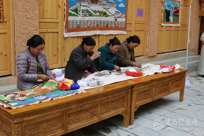 在藏繡展點,5名農(nóng)牧民婦女正在合繡一幅藏族建筑刺繡作品?!拔覐?6歲開始跟著父親學(xué)藏繡,傳到我這已經(jīng)是第四代了。除了‘六長壽’、度母像等傳統(tǒng)圖案,今年是新中國成立70周年,我還繡了一幅天安門作品?!?7歲的傳承人達打介紹道。