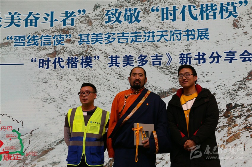 在分享會舞臺的一側(cè),靜置著書籍《雪線信使——“時代楷模”其美多吉》放大后的封面。封面上,其美多吉、藍(lán)天與雪山相得益彰,構(gòu)成了一幅獨(dú)具特色的畫面。