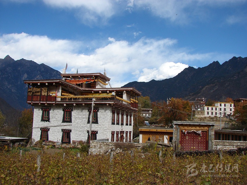 當(dāng)翻過一處斷崖,眼前豁然開朗。一大片平整的田地出現(xiàn)在我們的面前。田地里,一棟棟白色的藏房或鶴立雞群,或三五聚集,看似毫無規(guī)律,其實(shí)從整個房屋大門的朝向可以看出,在房基的選擇時,對陽光的接納面、風(fēng)水等都作了充分的考慮。