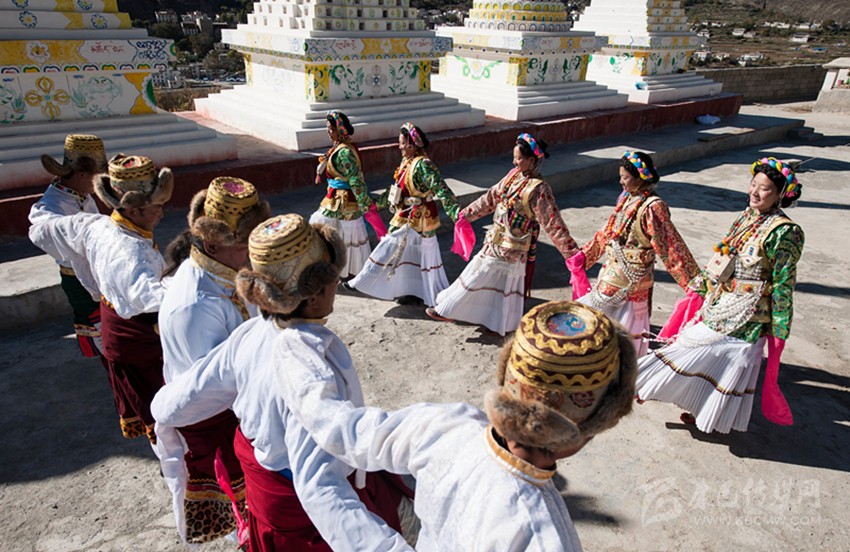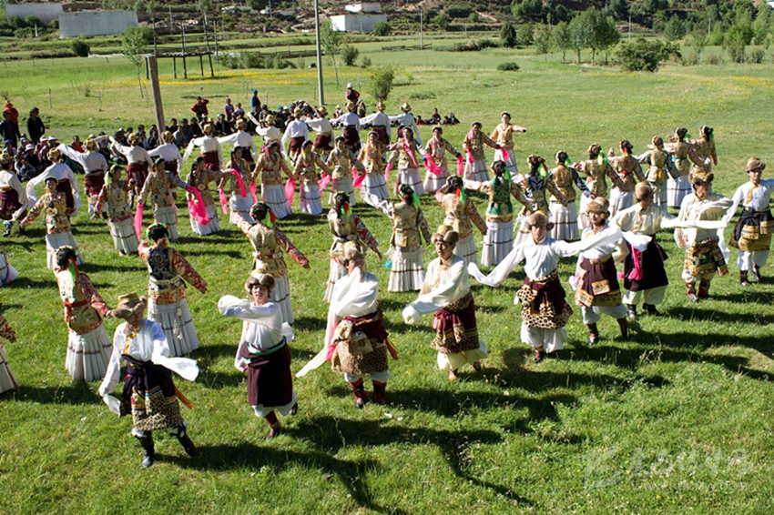 這當(dāng)中最具有依憑的觀點(diǎn)是:“學(xué)羌”是藏族傳說人物江根阿坡創(chuàng)作的,他綜合了康巴三江沿岸的鍋莊與踏歌的舞步,又融入了滇西北少數(shù)民族的一些舞蹈元素。從歷史上看,得榮瓦卡(茶馬古道金沙江碼頭)曾是茶馬古道上的一座重鎮(zhèn),各民族的馬幫和商人曾集聚在瓦卡碼頭?;蛟S,人們常常在這里載歌載舞,久而久之,在碰撞和交流中慢慢融合出了一個(gè)新的舞蹈:學(xué)羌。