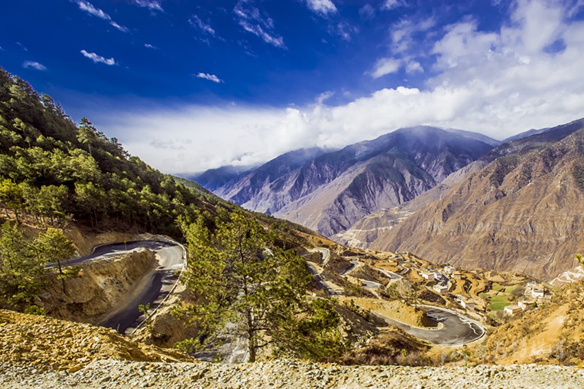如今,所有鄉(xiāng)村通了硬化路,橫跨在金沙江上的十余座跨江大橋氣貫如虹,天塹變通途。過去我們下鄉(xiāng)時(shí),從日雨到曲雅貢,只有一條從因都?jí)伪澈蟮陌肷窖贰In茫大山,路上幾乎看不見一顆大樹,也找不到一滴水源。從山腰看江畔的因都?jí)危挥袃蓱羧思?,幾株綠樹總令焦渴難耐的我們望“綠”興嘆!下山走到金沙江邊,熾烈陽光從河灘上反射,火辣辣照在臉龐和皮膚,熱浪令人窒息,感覺目的地遙不可及?,F(xiàn)今,干部下村完全不需要走路,走路下鄉(xiāng)對(duì)年輕人來說簡直不可思議。公路像一條飄帶環(huán)繞山間,使散落在峽谷中的村寨愈發(fā)展現(xiàn)出欣欣向榮的新風(fēng)貌。