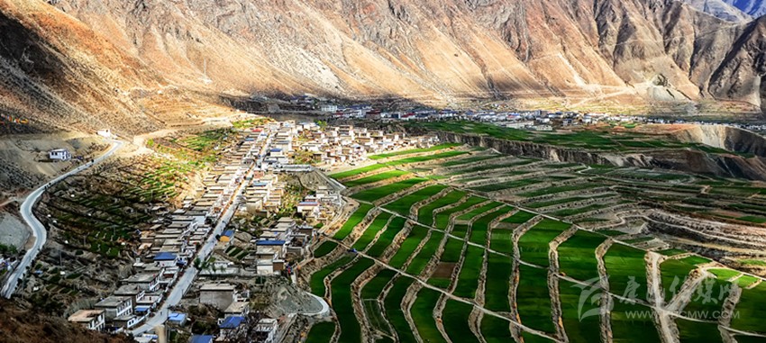 從得榮縣城出發(fā),途經(jīng)日龍鄉(xiāng),汽車順著盤山公路開始往下行駛,到半山腰處,司機(jī)輕輕踩一腳剎車熄火,在此作短暫休息。這時(shí),我打開車門俯瞰金沙江畔的因都?jí)?,但見公路兩?cè)一排排整齊的房屋像火柴盒一樣連綴在平坦壩子上,房屋下端,麥田梯次舒展,麥浪涌動(dòng),蔚為壯觀。