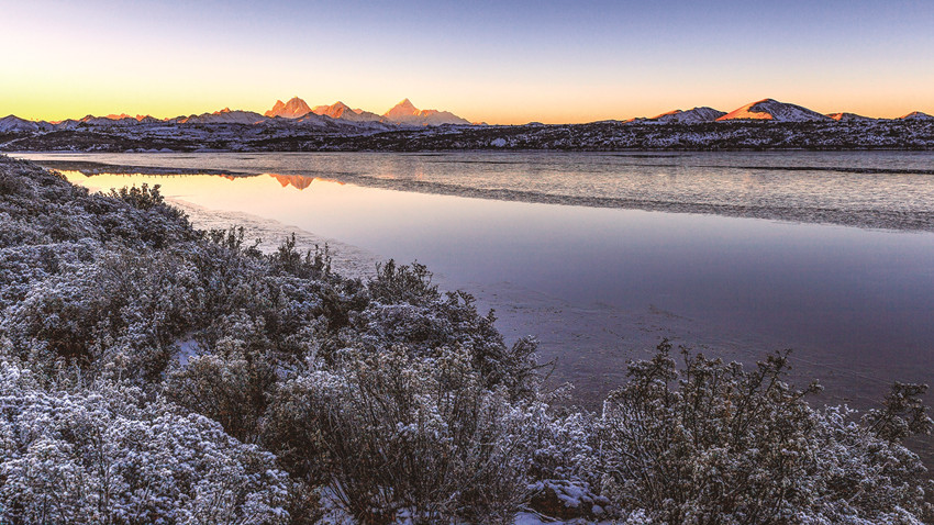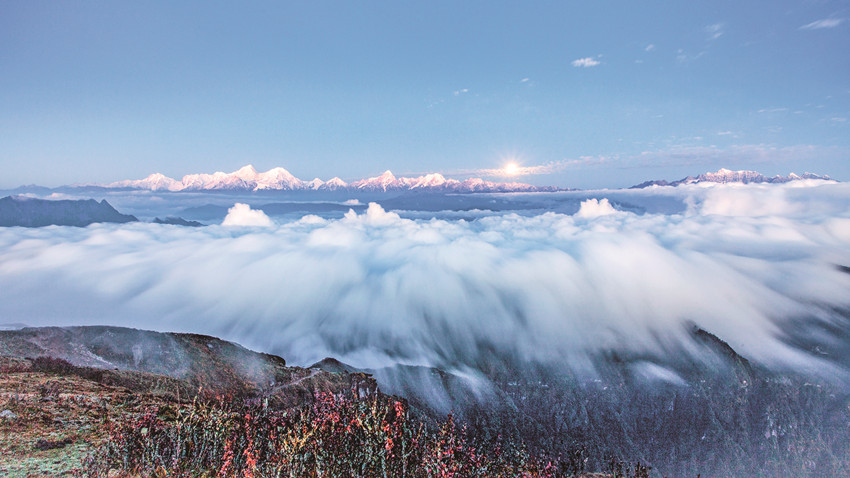 這是天上貢嘎寬大為懷、兼容并包的不凡氣度。它以獨具魅力和氣吞山河的雄偉壯麗,以及無法憾動的王者之軀,包容并呵護著無數群峰、千溝萬壑、萬物生靈和諧共生共處,展現出一幕幕眾山拱衛(wèi)下精致的山岳大戲。如此這般,既把自身推向了高點,又使依偎在身邊甚至遠處的萬物生靈各得其所、各展其長、各有所獲。