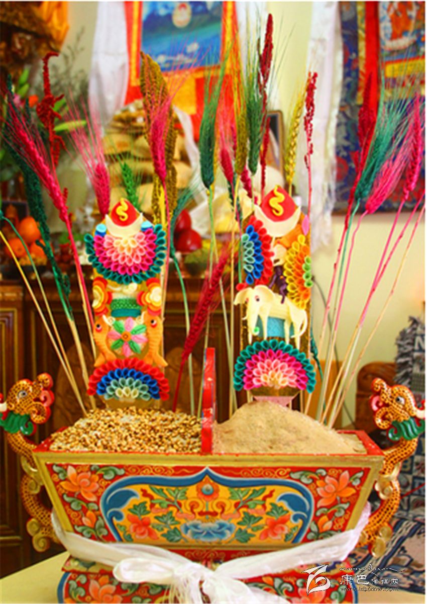 藏歷正月初一,全家人不論男女老少都穿著嶄新的藏裝外出;民居也煥然一新,屋頂?shù)乃慕怯昧鴺渲ωQ起了新的經(jīng)幡,門簾也換上了新的,屋內(nèi)外的香布也是新的。