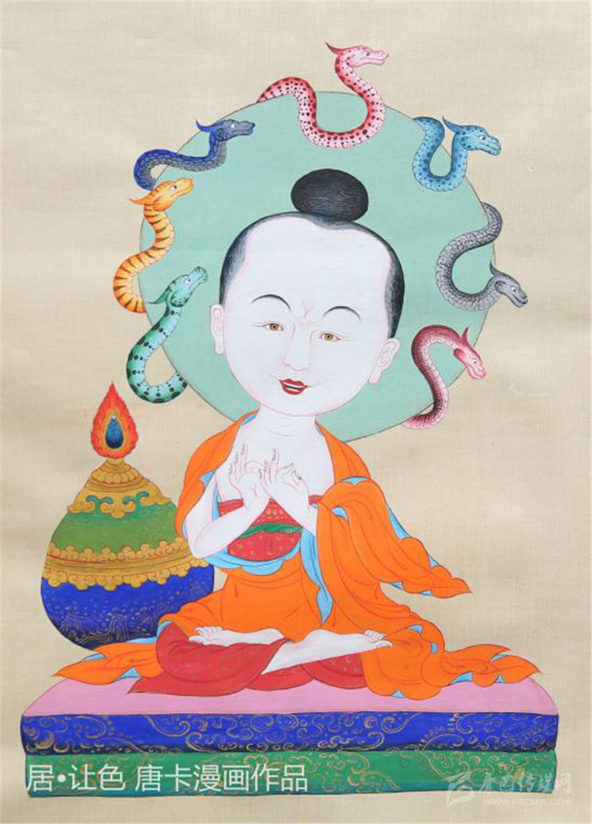 他創(chuàng)作的漫畫唐卡是以藏族傳統(tǒng)唐卡藝術(shù)為支點(diǎn),融合現(xiàn)代漫畫風(fēng)格方式表達(dá)的繪畫作品。居?讓色2018年展出的九副唐卡作品《青春永駐的六勝二莊嚴(yán)》是藏族唐卡繪畫史上的第一個(gè)傳統(tǒng)與現(xiàn)代繪畫藝術(shù)相結(jié)合的精品唐卡。