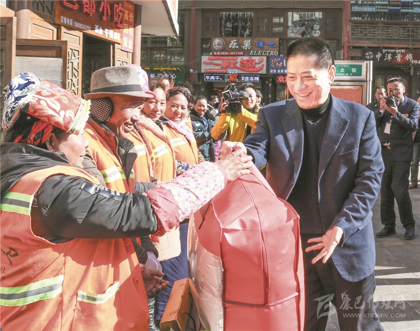 “你們每月工資多少?都按時(shí)領(lǐng)到了嗎?”在將軍橋環(huán)衛(wèi)點(diǎn),劉成鳴與環(huán)衛(wèi)工人親切交談,并一一握手問好。劉成鳴代表州四套班子向奮戰(zhàn)在環(huán)衛(wèi)戰(zhàn)線上的全體干部職工致以崇高敬意和新春問候,對環(huán)衛(wèi)工人為創(chuàng)造康定潔凈、舒適、優(yōu)美的市容環(huán)境所付出的辛勤勞動(dòng)表示衷心感謝。他說,環(huán)衛(wèi)工作特別辛苦,又臟又累,環(huán)衛(wèi)工人以“寧愿一人臟、換來萬人潔”的奉獻(xiàn)精神,起早摸黑,頂風(fēng)冒雪,不畏嚴(yán)寒,埋頭苦干,特別在去年我州舉辦一系列重大節(jié)慶活動(dòng)中出色完成了工作任務(wù),在平凡的工作崗位上做出了不平凡的業(yè)績,為推動(dòng)我州經(jīng)濟(jì)社會(huì)發(fā)展作出了積極的貢獻(xiàn)。他希望大家在新的一年里,再接再厲,繼續(xù)發(fā)揚(yáng)無私奉獻(xiàn)精神,立足本職,愛崗敬業(yè),努力拼搏,再創(chuàng)佳績,把康定打扮得更加靚麗、更加美好,為城市環(huán)境衛(wèi)生建設(shè)做出新的貢獻(xiàn)。