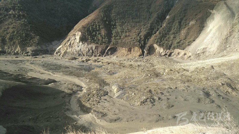 上午10點(diǎn)過(guò),突擊隊(duì)抵達(dá)生公村一個(gè)山坡上,看見(jiàn)了堰塞體。隨后,突擊隊(duì)繼續(xù)出發(fā),下午5點(diǎn)過(guò),突擊隊(duì)終于抵達(dá)了距離壩體約200米遠(yuǎn)的地方,并在這里用衛(wèi)星電話向后方播報(bào)了信息后,便攀上了高約70米,寬約200米的堰塞體實(shí)地查勘,并再次向后方匯報(bào)了情況。