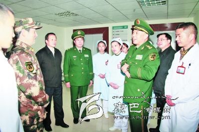 他還走進(jìn)每一個(gè)科室,檢查工作,與醫(yī)務(wù)人員交談,走進(jìn)病房,看望慰問(wèn)正在這里接受治療的部隊(duì)官兵。