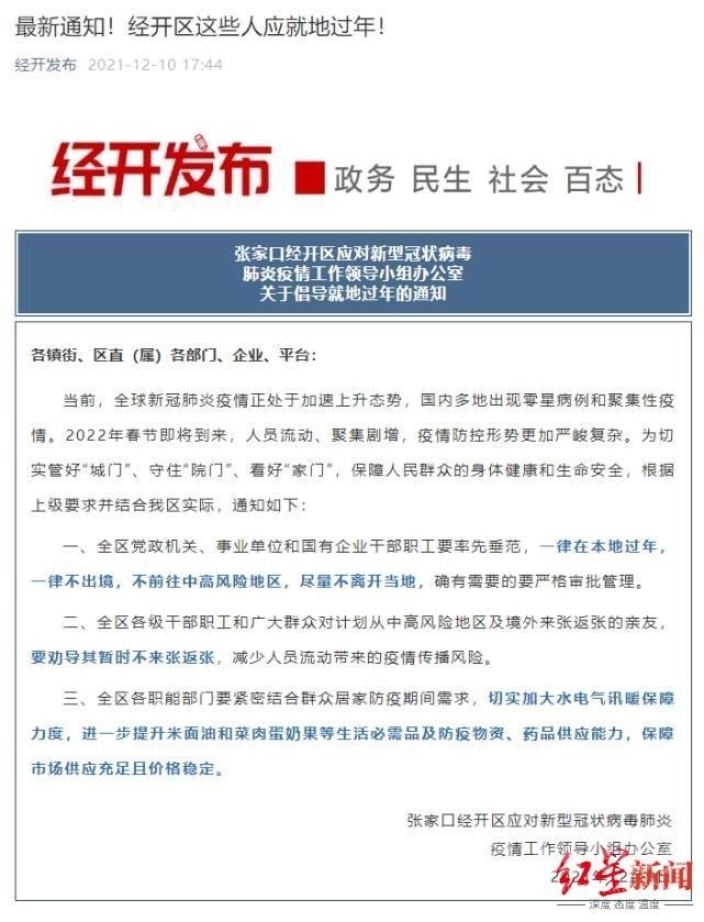 12月9日,河北張家口經(jīng)開區(qū)也發(fā)出通知:全區(qū)黨政機(jī)關(guān)職工等就地過年。通知中倡導(dǎo):全區(qū)黨政機(jī)關(guān)、事業(yè)單位和國(guó)有企業(yè)干部職工要率先垂范,一律在本地過年,一律不出境,不前往中高風(fēng)險(xiǎn)地區(qū),盡量不離開當(dāng)?shù)?,確有需要的要嚴(yán)格審批管理。