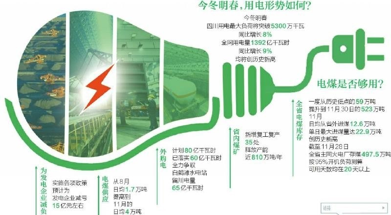 截至11月28日,全省主網(wǎng)火電廠存煤497.5萬噸,按95%開機(jī)負(fù)荷測(cè)算,可用天數(shù)均在20天以上。同時(shí),國網(wǎng)四川省電力公司全力落實(shí)外購電量和留川電量,外購電計(jì)劃80億千瓦時(shí)已落實(shí)60億千瓦時(shí),全力爭(zhēng)取白鶴灘水電站留川電量65億千瓦時(shí)。