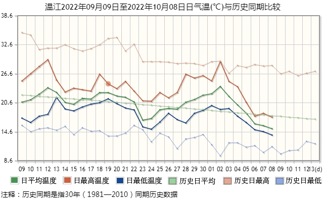 在盆地區(qū),溫江國家氣象站的觀測顯示,10月2日以來,當(dāng)?shù)氐娜掌骄鶜鉁?、日最高氣溫、日最低氣溫都是一路快速下行,使前期偏高的氣溫向著歷史均值快速回歸。