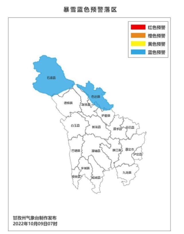 10月9日上午,甘孜州氣象臺(tái)發(fā)布了今年第一個(gè)暴雪藍(lán)色預(yù)警: