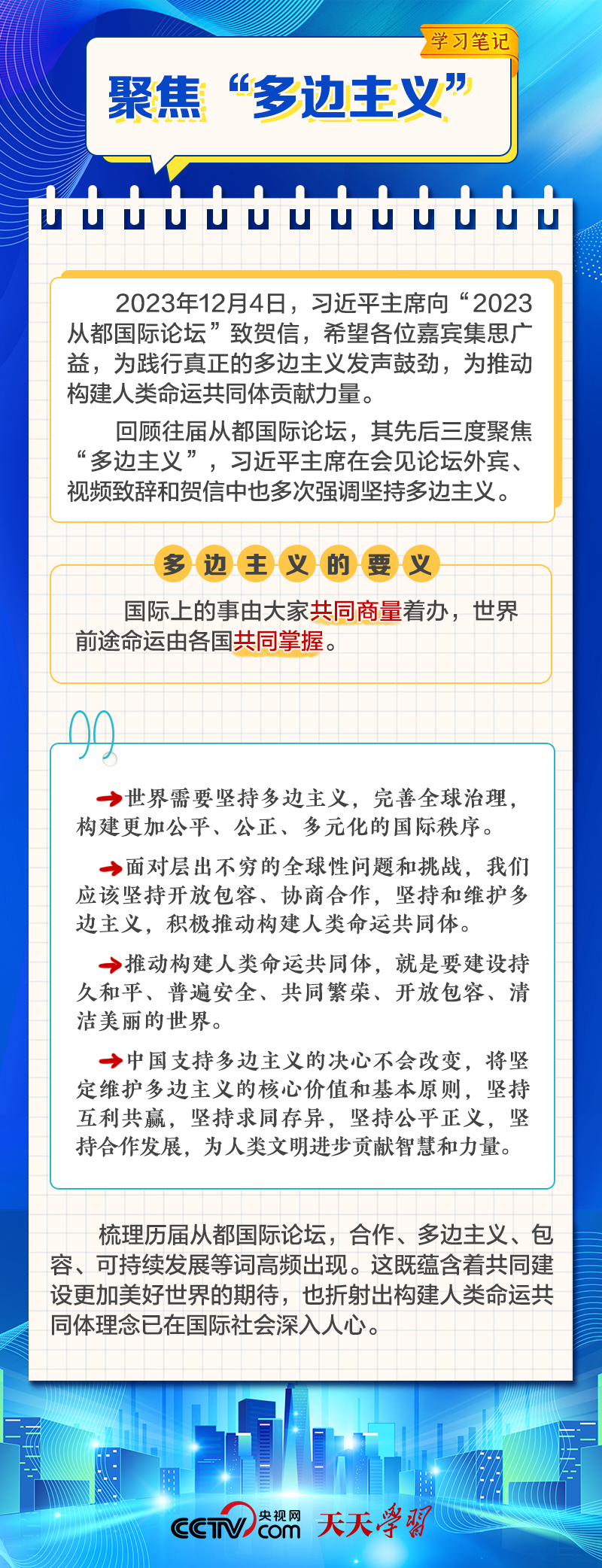 天天學習12月4日,習近平主席在致“2023從都國際論壇”的賀信中強調(diào),面對前所未有的世界之變、時代之變和歷史之變,人類社會必須團結(jié)起來,堅持互學互鑒、開放包容、合作共贏,弘揚全人類共同價值,共同建設(shè)更加美好的世界。