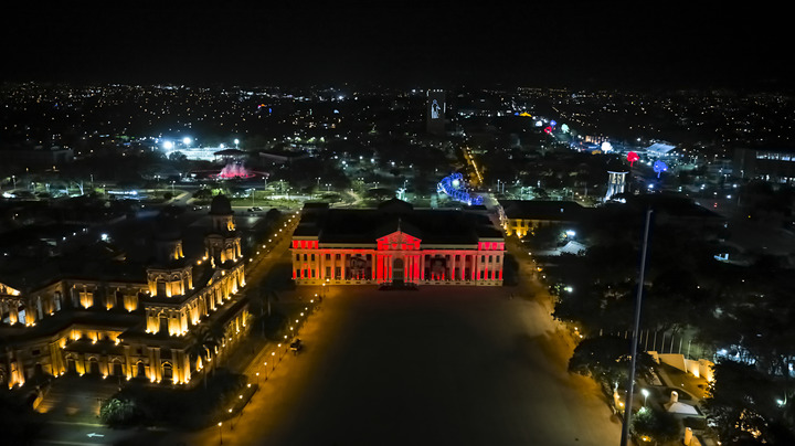 2022年1月31日,尼加拉瓜首都馬那瓜市中心標志性建筑國家宮點亮“中國紅”(無人機照片)。