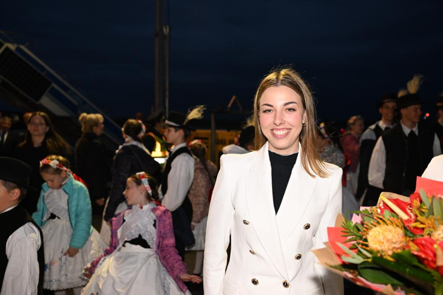 ??當(dāng)?shù)貢r間5月8日晚,在匈牙利布達(dá)佩斯國際機(jī)場歡迎隊(duì)伍中的匈牙利姑娘歐拉·塔瑪拉。新華社記者 謝環(huán)馳 攝