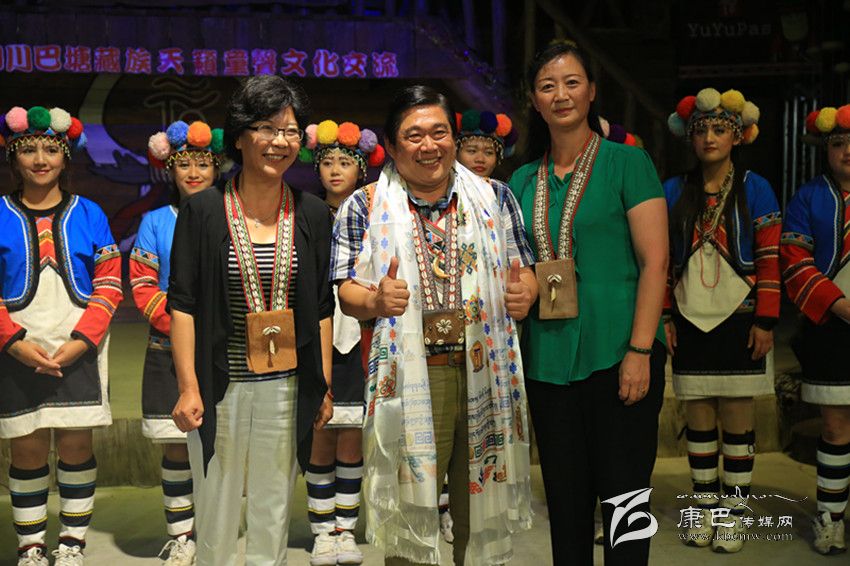 巴塘縣委常委、宣傳部長張平樹,縣政府副縣長王文英,優(yōu)游吧斯股份有限公司董事長鄭虞坪與高山族演員合影。