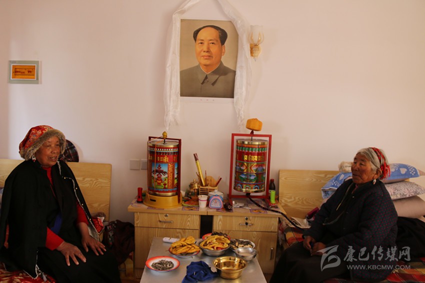 從餐廳出來,記者走進了一間15平方米左右的宿舍。兩位老人正坐在各自的木床上看電視,墻上掛著的液晶電視是連著機頂盒的。兩床之間,放著藏桌和床頭柜,藏桌上有瓜子、花生、酥油果子、牛肉等食品,亞瑪翁青老人熱情地說:“因為正在過藏歷新年,這些都是福利院為我們備的年貨,你也嘗嘗!”。房間里最引人注目的便是掛在床頭柜上方的系著哈達的毛主席畫像,兩位老人指著毛主席畫像動情地說:“毛主席、共產(chǎn)黨是我們的恩人,看著他的畫像我們安心?!贝送?,房間里還有衣柜、配有馬桶的獨立廁所和盥洗臺,毛巾、漱口盅、掃把、拖把都整齊地放在對應(yīng)位置。亞瑪翁青笑著說:“我們住的房間都趕得上縣城里的賓館了?!?/span>